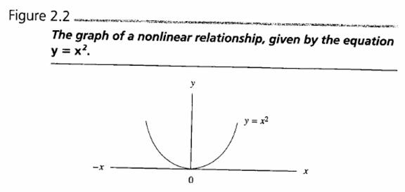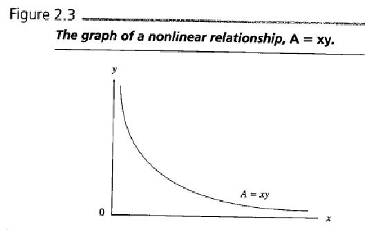 Desigur, alternativa la o relatie liniara este o relatie nonliniara. În general, legaturile nonliniare sunt mai dificil de gestionat decât relatiile liniare. Ele frecvent, desi nu întotdeauna, sunt caracterizate de variabile independente ridicate la o putere printr-un exponent. Exemple sunt y = x2 si y = 5/x1/2. Figura 2.2 prezinta graficul lui y = x2. O alta legatura nonliniara comuna în economie este data de exemplu A = xy, unde A este o constanta. Un grafic al acestei functii este dat în Figura 2.3.