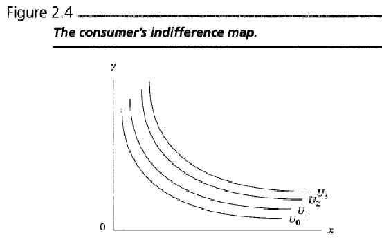 Aici am desenat mai multe curbe de indiferenta. Fiecare curba reprezinta toate combinatiile de x si y care dau consumatorului aceeasi cantitate de utilitate sau bunastare. Alternativ, putem spune ca gusturile consumatorului sunt astfel încât el este indiferent pentru toate combinatiile de x si y care care sunt situate de-alungul unei curbe date - de aici numele de curba indiferentei. Astfel, toate acele combinatii de x si y aflate pe curba indiferentei marcata cu U0 , dau consumatorului aceeasi utilitate. Acele combinatii situate pe curba de indiferenta superioara marcata cu U1 dau acestui consummator o utilitate similara, dar acest nivel de utilitate este mai ridicat decât cel al tuturor acelor combinatii de x si y situate pe curba de indiferenta U0 .