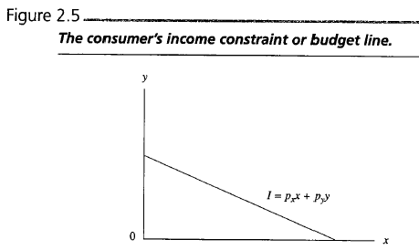 Problema optiunii consumatorului apare din coliziunea preferintelor consumatorului cu obstacolele în satisfacerea acestora. Obstacolele sunt constrângeri care forteaza decidentul sa aleaga dintre alternative. Exista multe constrângeri, incluzând timpul, energia, cunostintele si cultura cuiva, dar cel mai des întâlnita este venitul limitat. Putem reprezenta constrângerea venitului consumatorului, sau linia bugetului asa cum este numita în Figura 2.5.
