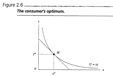 Putem caracteriza maximul venitului constrâns al consumatorului M din Figura 2.6, în termeni ai egalitatii dintre costul si beneficial marginal. Mici schimbari, în oricare directie, de-alungul liniei de buget I, reprezinta o situatie în care consumatorul cheltuie cu un dolar mai putin pentru unul dintre bunuri si un dolar mai mult pentru celalalt. Pentru a masura costul si beneficiul acestor schimbari marginale de-alungul liniei de buget, folosim notiunea de schimbari mici sau marginale în utilitate. De exemplu, daca scade cu un dolar suma pentru cumpararea lui y, aceasta deplasare cauzeaza o pierdere în utilitate pe care o putem numi costul marginal al realocarii bugetului. Dar dolarul cheltuit anterior pe y poate fi acum cheltuit pe x. Mai multe unitati din x înseamna o utilitate mai mare, astfel ca putem numi aceasta crestere ca beneficiul marginal al realocarii bugetului. Sa presupunem ca consumatorul se gândeste daca sa cheltuiasca un dolar mai putin pe bunul y si un dolar mai mult pe x. O va face? Numai daca costul marginal (descrsterea în utilitate datorata faptului ca are din y de un dolar mai putin) este mai mic decât beneficiul marginal (cresterea în utilitate din faptul ca are cu un dolar mai mult din x). Consumatorul va continua sa realoce dolarii de la cumpararea lui y si îi va directiona spre cumpararea lui x, pâna când procesul se va opri si maximul venitului constrâns va fi atins când beneficiul marginal al ultimei schimbari facute este egal cu costul marginal. Aceasta are loc în punctual M din Figura 2.6.