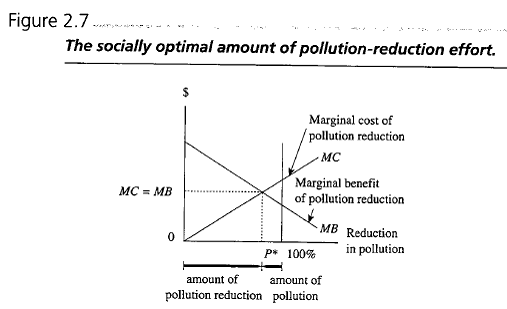 Data fiind scaderea beneficiului margial si cresterea costului marginal, întrebarea care apare este: "Care este cantitatea optima de efort de reducere a poluarii ?" O examinare a Figurii 2.7 arata ca P* este cantitatea optima social a efortului de reducere a poluarii. (De notat ca (100% - P*) este cantitatea optima de poluare). Orice scadere va cauza o reducere a beneficiilor care ar fi mai mare decât economiile de costuri.