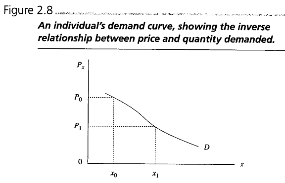 Pornind din punctul M din Figura 2.6, trebuie notat ca atunci când pretul lui x este acela dat de linia de buget, cantitatea optima din x pentru consum este x*. Dar ce cantitate din x va dori acest consummator sa cumpere astfel încât sa maximizeze utilitatea când pretul lui x este mai scazut decât cel dat de linia de buget din Figura 2.6 ? Putem raspunde la aceasta întrebare tinând Py si I constante, lasând Px sa cada si notând cantitatea din x din pachetele optime urmatoare. Nu este surprinzator, rezultatul acestui exercitiu va fi ca pretul lui x si cantitatea din x din pachetele optime se afla în relatie inversa. Adica, atunci când pretul lui x creste, cantitatea din x pe care o va cumpara consumatorul scade, si vice versa. Acest rezultat este faimoasa lege a cererii.