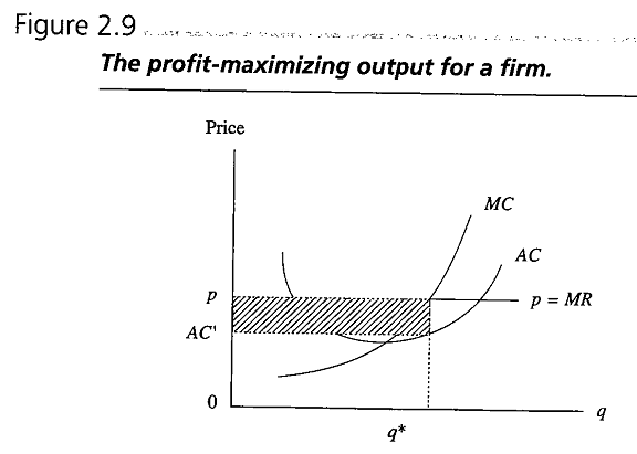 În Figura 2.9 outputul care maximizeaza profitul firmei este prezentat de punctul în care curba costului marginal si curba venitului marginal al firmei sunt egale. Nivelul de output care maximizeaza profitul, este notat cu q*. Profiturile totale la acest nivel al productiei, notata prin aria hasurata din figura, este egala cu diferenta dintre veniturile totale ale firmei (p înmultit cu q*).