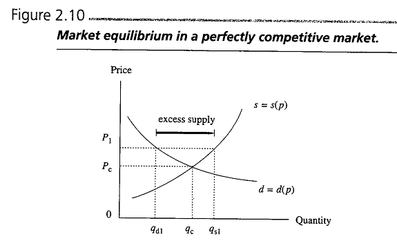 O cale de a vedea de ce combinatia Pc, qc din Figura 2.10 este un echilibru este sa vedem ce s-ar fi întâmplat daca ar fi fost obtinuta o combinatie diferita pret - cantitate. Sa presupunem ca pretul initial al pietei era P1. La acel pret, producatorii si-ar maximiza profiturile prin furnizarea cantitatii qs1 de output si consumatorii care-si maximizeaza utilitatea ar fi pregatiti ca cumpere qd1 unitati de output. Aceste decizii de oferta si cerere sunt inconsistente: la P1 cantitatea pe care furnizorii ar dori sa o vânda depaseste cantitatea pe care consumatorii ar dori sa o cumpere. Cum va reactiona piata la acest exces de oferta? În mod clar, pretul pietei trebuie sa cada. Daca pretul scade, consumatorii vor cere mai mult si producatorii vor furniza mai putin , astfel ca diferenta dintre oferta si cerere se va diminua. Eventual, pretul poate atinge valoarea Pc. La acest pret, asa cum am vazut, cantitatea pe care furnizorii doresc sa o vânda si cantitatea pe care consumatorii doresc sa o cumpere sunt egale.