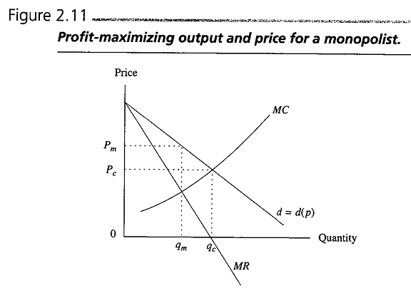 Monopolistul maximizeaza profitul sau prin alegerea acelui nivel de output pentru care venitul marginal si costul marginal sunt egale. Acest nivel de output, qm, este prezentat în Figura 2.11. Curba cererii indica faptul ca consumatorii doresc sa plateasca Pm pentru acea cantitate de output. De notat ca daca aceasta industrie ar fi fost competitiva în loc de monopolista, actiunile firmei de maximizare a profitului ar fi avut ca si rezultat un pret de echilibru si o cantitate la intersectia curbei ofertei agregate, S, si curba cererii industriei, D. Pretul competitiv, Pc, este mai scazut decât pretul monopolist si cantitatea de output produs si consumat în conditii de competitie, qc, este mai mare decât cel în conditii de monopol.