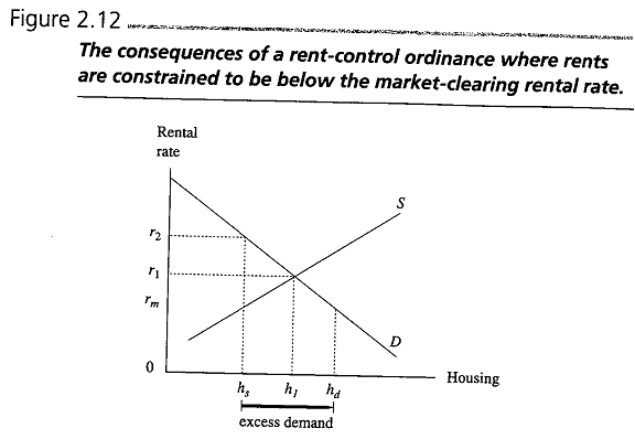 Dar, sa presupunem acum ca gurvenul local determina ca r1 este prea ridicat. Acesta adopta o ordonanta care specifica rata de închiriere maxima pentru case de rm, considerabila sub rata de echilibru a pietei. Speranta guvernului este aceea ca cel putin aceeasi cantitate de case va fi consumata de cei care închiriaza, dar la o rata de închiriere mai scazuta. Totusi, o privire pe Figura 2.12 conduce la una dintre îndoielile care rezulta. La rm, consumatorii cer hd unitati de case de închiriat. O cestere a cantitatii cerute la o rata mai mare, r1. Dar la aceasta rata mai scazuta, furnizorii sunt pregatiti sa ofere numai hs unitati de case pentru închiriat. Aparent, nu le merita sa aloce atât de mult din unitatile lor de case chiriasilor la aceasta rata scazuta; probabil, daca rm este tot ceea ce poate fi obtinut din închirierea unitatilor de case, furnizotii prefera sa comute unele dintre unitatile lor altor utilizari, cum ar fi ocuparea de catre familia proprietarului sau vânzarea lor ca si condomenii. Rezultatul plafonarii ratei impusa de catre guvern este o lipsa de, sau exces de cerere pentru, unitati de închiriere de (hd - hs).