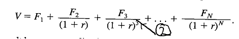 Putem raspunde la aceasta întrebare prin calcularea valorii scontate prezenta[1] a fluxului viitor de intrari nete. Sa presupunem ca detinerea unui anumit activ va genera F1 intrari nete la sfârsitul primului an; F2 intrari nete la sfârsitul celui de al doilea an; F3 intrari nete la sfârsitul celui de al treilea an; si FN intrari nete la sfârsitul celui de al n-lea an; Valoarea scontata prezenta a acestui active este egala cu:
