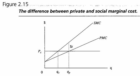 Costul marginal privat, în exemplul nostru, este costul marginal al productiei pentru fabrica. Costul marginal social este suma costului marginal privat si costurile marginale aditionale impuse involuntar unei terte parti de fiecare unitate de productie. Diferenta este prezentata în Figura 2.15. Costul marginal social este mai mare decât costul marginal privat la fiecare nivel de output. Diferenta verticala dintre cele doua curbe este egala cu cantitatea de cost marginal extern la oricare nivel de output. De notat ca daca productia este zero, nu este externalitate, dar pe masura ce productia creste, cantitatea de cost extern per unitatea de output creste.