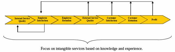 Schlesinger si Heskett (1991) sustin de asemenea ca resursele umane sunt o resursa critica in activitatile de servicii si propun un lant de servicii/profit, dupa cum se arata in Figura 3.3. Acesti autori sustin ca daca compania detine doar satisfactia angajatilor si rata de retentie, in consecinta, ar putea fi posibil sa se ajunga la satisfactia si atragerea clientilor si, in consecinta, s-ar ajunge la un avantaj competitiv. O idee similara a fost propusa de Rucci (1994), care evidentiaza importanta angajatilor in lantul servicii/valoare - numita lantul de profit angajat/client.