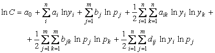 O functie de cost de productie pe termen lung, cu structura translog, pentru n tipuri de servicii realizate, de dimensiuni yi, când sunt folositi m factori de productie, la preturile pj, are forma: