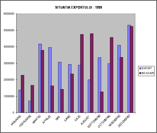 Evolutia operatiunilor de export în anul 1999 comparativ cu cea a încasarilor din export este prezentata sugestiv în graficul nr.1:
