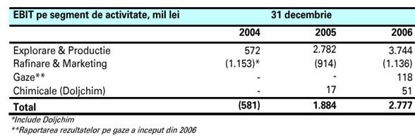Cresterea EBIT (Profitul brut) în 2006 pâna la 2.777 mil lei (+47%) a fost determinata de cresterea rezultatului în activitatea de E&P (Explorare si Productie), cat si de cresterea vânzarilor. Rezultatele au fost influentate negativ de elementele speciale în valoare de 324 mil lei. Contributia E&P la EBIT a crescut semnificativ la 3.744 mil lei (2005: 2.782 mil lei) în principal din cauza preturilor mai ridicate la titei si în mai mica masura datorita cresterii pretului gazelor.