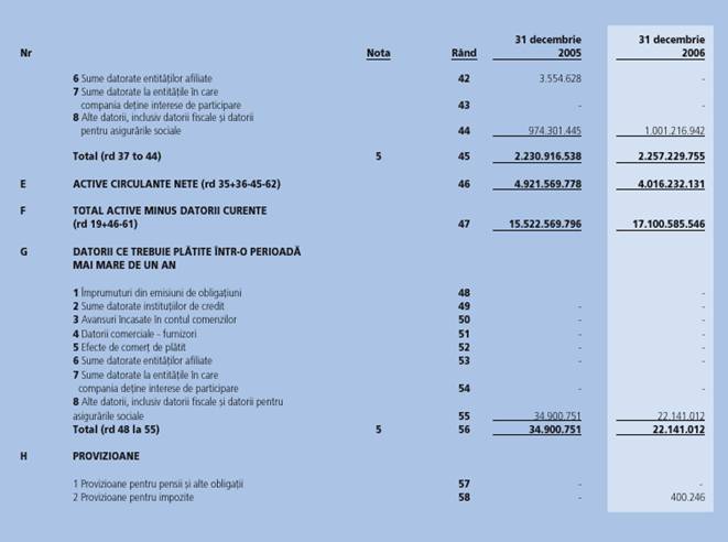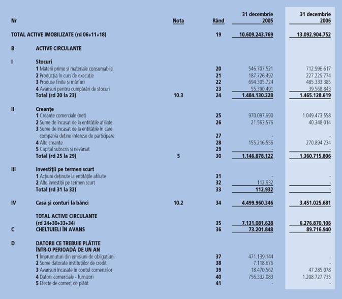 Activele circulante, incluzând platile în avans, au scazut cu 12% în comparatie cu 2005, atingând 6.366 mil lei. Modificarea este atribuita urmatoarelor elemente: