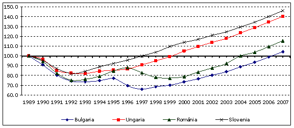Dupa 1990, Romānia a implementat o serie de reforme politice si economice īn vederea transformarii economiei de la "plan la piata". Transformarile postcomuniste, īn Romānia ca si īn celelalte tari din Centrul si Estul Europei, au dus initial la un declin sever al PIB. Īntre 1988 si 1992, PIB-ul Romāniei a scazut cu 30%. Dupa o scurta revenire, a urmat o a doua perioada de recesiune economica īntre 1997 si 1999. Cresterea economica robusta a īnceput doar īn anul 2000. Īn anul 2004, PIB-ul a atins nivelul din anul 1989, dar īn 2005 acest indice al bunastarii generale īnca reprezenta mai putin de o treime din media tarilor UE-25.