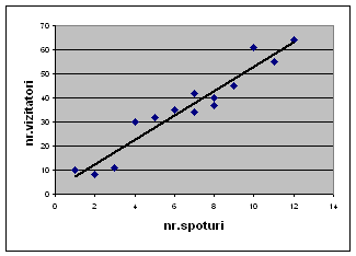 Notam cu X variabila factoriala, independenta "nr.spoturi publicitare" si cu Y variabila dependenta "nr.vizitatori".