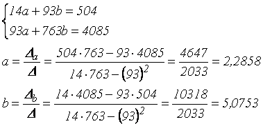 b) Pentru a determina estimatorii a si b, rezolvam sistemul de ecuatii normale, folosind datele din tabelul de lucru de mai jos: