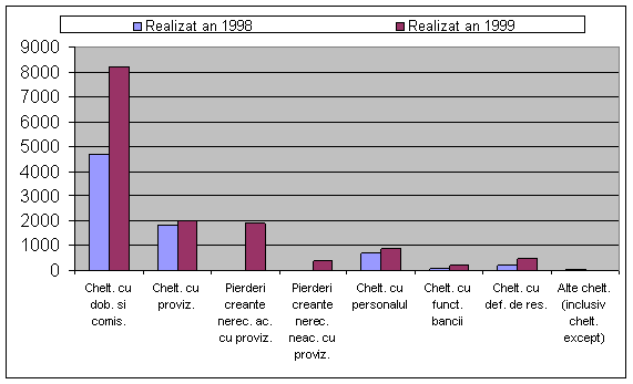 In anul 1999 a continuat politica de provizionare a creantelor bancii, nivelul cheltuielilor cu provizioanele aferente retelei bancii fiind in suma de 1727 miliarde lei, ceea ce procentual reprezinta 12,3% din totalul cheltuielilor. In anul 1998 cheltuielile cu provizioane au insumat 1573 miliarde lei, ceea ce procentual a reprezentat 21,1% dint totalul cheltuielilor retelei. Mentionam ca in anul 1999 au aparut alte elemente de cheltuieli ca urmare aplicarii legislatiei in vigoare si normelor B.N.R. reprezentand pierderi din creante nerecuperabile acoperite cu provizioane in suma de 1736 miliarde lei fiind situata la un nivel aproximativ egal cu cheltuielile cu provizioanele si pierderi din creante nerecuperabile neacoperite cu provizioane in suma de 517 miliarde lei.
