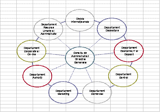 Obiectivele manageriale a departamentelor: Obiectivele manageriale sunt in concordanta cu obiectivele generale ale organizatiei. Departament Dezvoltare: contractarea de noi spatii comerciale in vederea extinderii lantului de magazine Departament Economic: evidenta situatiei financiare a companiei:venituri, cheltuieli,cifra de afaceri, profit, balanta, bilant / receptia, depozitarea, ambalarea si livrarea produselor catre magazine / suport IT pentru birouri si magazine Departament Control: asigurarea bunei functionari a proceselor financiare si non-financiare ale companiei prin auditare Departament Comercial: promovarea si comercializarea produselor companiei in reteaua de magazine la nivel national Departament Marketing: cresterea notorietatii brandului Meli Melo Departament Achizitii: achizitionarea si aprovizionarea retelei de magazine cu produsele companiei Departament Corporate si On-line: promovarea si comercializarea produselor catre clienti, persoane fizice sau juridice. Departament Resurse Umane si Administrativ: definirea si implementarea strategiei si politicii de RU in concordanta cu obiectivele de dezvoltare a companiei Divizia Internatioanala: extinderea brandului la nivel international Diagrama organizationala a societatii este schema care reglementeaza cooperarea si controlul in cadrul firmei, sarcini, responsabilitati, autoritate etc. 1.6. Sistemul informational Sistem informational manual sau computerizat, proiectat si aplicat cu scopul de a furniza managerilor de la toate nivelurile si functiile informatiile parvenite din sursele interne si externe organizatiei, pentru comunicarea si utilizarea acestora īn adoptarea de decizii eficiente īn activitatile de previziune, organizare, coordonare si control, conform competentelor specifice. Sistemul informational prezinta