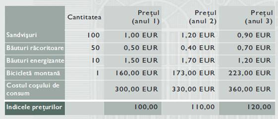 Indicele preturilor constituie o alta modalitate dea exprima acest lucru. Pentru a calcula indicele preturilor,costul cosului de consum aferent oricarei perioade se imparte la costul cosului de consum aferent perioadei debaza, iar rezultatul se inmulteste cu 100. In tabelul de maisus, anul 1 reprezinta perioada de baza. Asadar, indicelepreturilor pentru anul 3 este urmatorul: