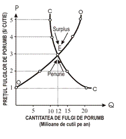 Cererea pentru fulgi de porumb este slaba cand pretul e ridicat si mare cand pretul e scazut. Oferta pentru acest produs e mica cand pretul e scazut si mare cand pretul e ridicat. In punctul E cererea si oferta sunt in echilibru. Numai la pretul de 3 $/cutie toate cele 12 milioane de cutii de fulgi de porumb aduse pe piata isi vor gasi cumparatori si piata se va goli. Peste pretul de echilibru furnizorii sunt pregatiti sa ofere dar cumparatorii nu sunt pregatiti sa ceara.Sub acest pret, consumatorii sunt cei pregatiti sa ceara in timp ce furnizorii nu sunt dornici sa ofere. Pretul care egalizeaza cererea si oferta este pretul pietei. Semnalul pe care piata il transmite agentilor economici (gospodarii casnice, firme, stat) este tocmai acest pret de piata ! Cererea si oferta reactioneaza in mod diferit la modificarea pretului de piata. Astfel, cererea poate reactiona prompt la schimbarea pretului deoarece consumatorii isi pot regla instantaneu cererea. Oferta, in schimb, nu poate reactiona prompt deoarece exista intotdeauna o diferenta de timp de cand cererea se modifica pana cand oferta se adapteaza la aceasta schimbare. Antreprenorul trebuie sa-si refaca planurile de activitate, sa treaca la fabricarea altui produs, sa construiasca o noua fabrica, sa insamanteze, sa foreze etc. inainte de a produce ceva.