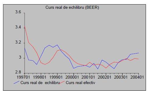 Pentru Romania, pentru determinarea cursului de schimb de echilibru, a fost construit, pebaza unui esantion de date trimestriale pe perioada trim. I 1997 – trim. I 2004, atat un modelBEER cat si un model structural, cu ecuatiile de echilibru obtinute pe baza metodologiei de conintegrare Johansen.
