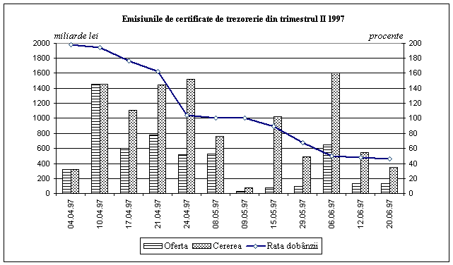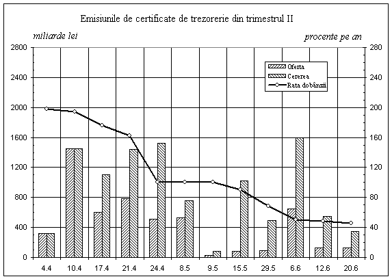 În aceste conditii, emisiunile noi de certificate de trezorerie din trimestrul II au avut ca destinatie acoperirea deficitului pe anul 1996. Pe parcursul trimestrului II, Ministerul Finantelor a lansat un numar de a3 emisiuni, cu o valoare nominala totala de 3626,8 miliarde lei.