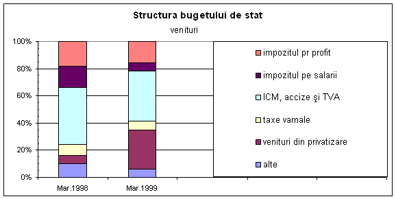 Analizând structura veniturilor bugetului de stat comparativ cu primul trimestru al anului 1998, se remarca o scadere cu 11,8 puncte procentuale a ponderii veniturilor din impozitele directe în totalul veniturilor si o crestere cu 21,1 puncte procentuale a ponderii veniturilor din capital, datorita încasarilor din vânzarea Romtelecom si a BRD.