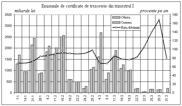 În primul trimestru, Ministerul Finantelor a lansat 21 de emisiuni de titluri de stat în valoare totala (exclusiv dobânda) de 16 785,2 miliarde lei. Dintre acestea, 18 emisiuni au fost realizate prin licitatie, iar teri emisiuni (cu o valoare nominala de 1 255 miliarde lei) au fost realizate prin subscriptie. Cererea de titluri de stat s-a mentinut, în continuare, mai ridicata decât oferta.