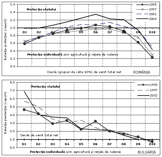 Figura 3 arata ca īn Romānia de-a lungul transformarilor structurale postcomuniste, nu se poate nicidecum vorbi despre dependenta fata de stat. Bunastarea este categoric o chestiune de efort individual, caci efortul depus de indivizi/gospodarii a fost pe de departe mai mare decāt efortul de protectie sociala depus de stat. Doar īn anul 2004 si doar pentru gospodariile cu venituri medii (decilele medii de venit, care concentreaza pensionarii), ponderea prestatiilor sociale depaseste contributia adusa la bugetul gospodariei de agricultura si retelele de rudenie. Asta nu īnseamna nicidecum ca saracii au depus mai putin efort decāt restul populatiei. Din contra, figura 3 arata ca saracii au depus un efort comparabil cu al celor bogati, dar lipsa lor de resurse (educatie, calificari, abilitati, proprietati, slujbe bine platite etc.) a dus la o situatie precara īn absenta unui suport adecvat din sistemul de protectie sociala. Iar īn aceasta privinta este utila comparatia cu situatia din Bulgaria (cu o pondere a saraciei absolute mult mai redusa decāt Romānia), care este similara cu a altor tari ex-comuniste (spre exemplu, Ungaria sau Slovenia), dar si a unor tari vestice dezvoltate, si arata ca pentru categoriile cele mai defavorizate protectia statului depaseste protectia individuala.