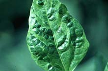 Atacul apare pe frunze, unde pe partea superioara se produc pete decolorate iar