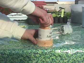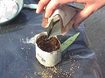Umpleti ghiveciul din hartie cu pamantul pentru insamantare, puneti semintele, acoperiti cu pamant si udati.