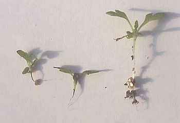 Cele doua plantute din stanga sunt atacate de ciuperca. Cea din dreapta este una normala. Stropirea cu ceai de musetel este o metoda infailibila pentru a scapa de ciuperca.