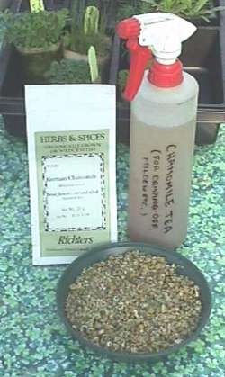 Faceti ceai de musetel asa cum va pace sa beti ( o lingurita de flori uscate la o ceasca de apa.) Puneti ceaiul racit si strecurat intr-un atomizor. Stropiti plantele si solul daca este necesar in fiecare zi. Nu tineti ceaiul mai mult de 7 zile, fiindca isi pierde calitatile.