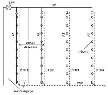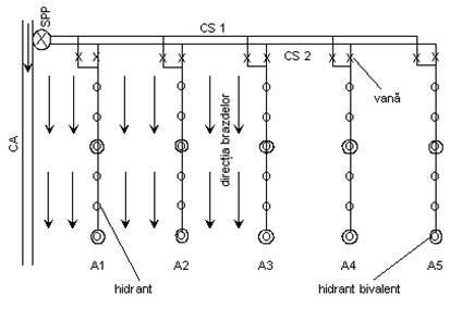 Este realizata pe baza schemei plotului de irigatie si echipata cu: doua tipuri de agregate (inalta si joasa presiune); conducte principale si secundare separate pentru cele doua linii de presiune; antene racordate separat, prin vane de distributie, la conductele principale si secundare; hidranti simpli si guri de apa bivalente amplasati pe antene (fig. 3).