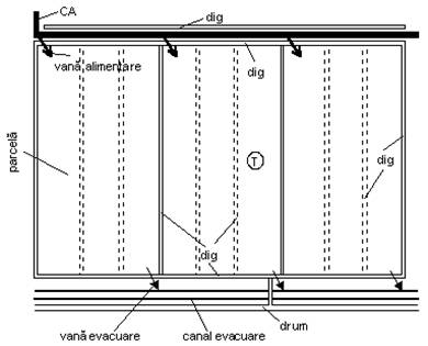 Teritoriul unei orezarii sistematice irigate prin submersie este amenajat si sistematizat in parcele, tarlale si sectoare de irigatie la care se adauga reteaua de alimentare cu apa, reteaua de evacuare a apei, diguletele de compartimentare si constructiile hidrotehnice (fig. 10).