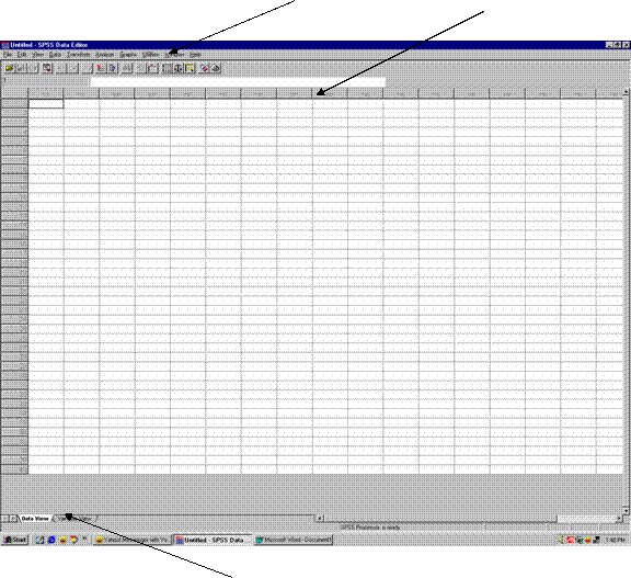 In figura 1 este prezentata interfata programului SPSS care se prezinta la fel ca interfetele programelor de calcul tabelar pe care le cunoasteti ( de exemplu programul EXCEL) Asa cum puteti observa, exista un meniu (Figura 1, sageata 1) a carui butoane vor fi explicate pe parcursul acestei lucrari.