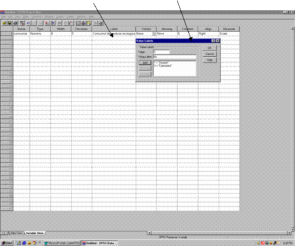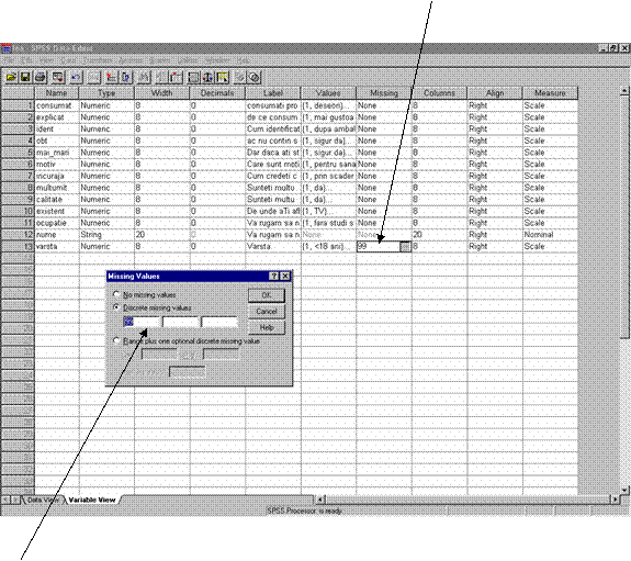 In fereastra "Variable View" se introduc atributele variabilei: nume (name), tip (type), lungimea (width), numar zecimale (decimals), eticheta (label), valorile etichetei (values), valorile lipsa (missing), alinierea (align) si modalitatile de masurare a variabilei (measure) ( scala, ordinal, nominal) (vezi figura 2).