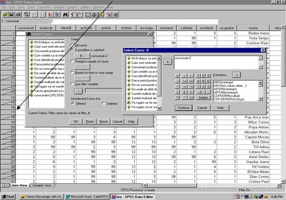 Dorim sa calculam deviatia de la frecventele teoretice pentru o distributie de 2 variabile: presupunem "varsta" si "consumat" . Selectam doar categoriile de vârsta între 18-65 de ani , cele mai numeroase în sondajul nostru. Pentru aceasta filtram doar categoriile de vârsta 2, 3,4 ( Vezi Data Select Cases) conditia (varsta >1 & varsta < 5)