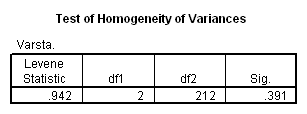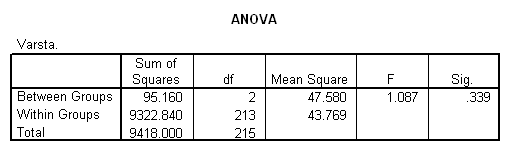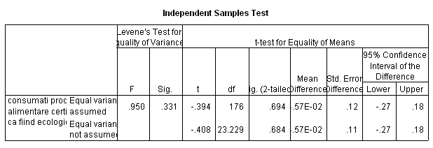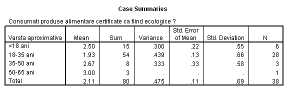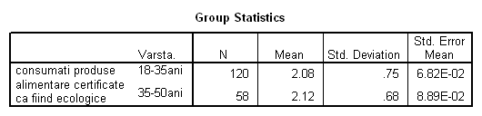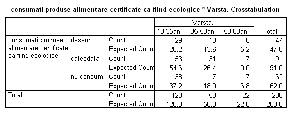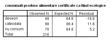 In figura de mai jos avem rezultatele testului Hi-patrat. Se observa coeficientul Sig. >0.05 ceea ce înseamna ca ipoteza de nul nu se respinge. Adica frecventele observate , nu difera de cele teoretice pentru nici una din cele trei categorii de consumatori. Cu alte cuvinte, comportamentul consumatorilor în ceea ce priveste consumul de produse ecologice nu este influentat de vârsta.