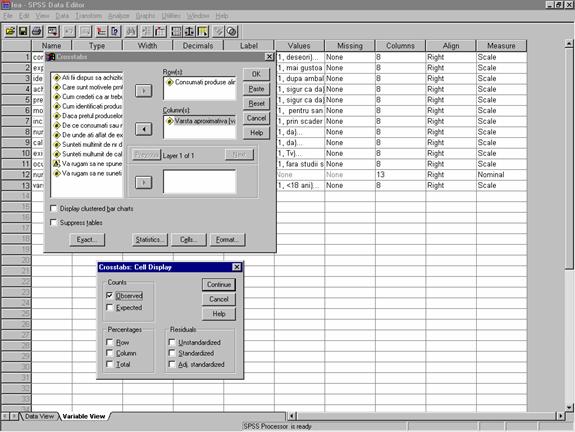 In fereastra Crosstabs la rubrica Row(s) trecem variabila "consumat" iar la rubrica column(s) trecem variabila "varsta" Actionând butonul Cells (sageata) se deschide fereastra Cells Display unde se selecteaza la rubrica "Counts" afisarea valorilor observate " Observed" si a valorilor teoretice asteptate " Expected".