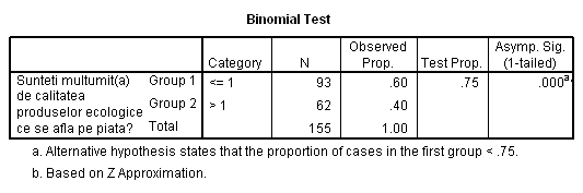 Astfel se observa ca proportia observata în esantion pentru grupa consumatorilor multumiti e de 60% . Datorita faptului ca valoarea Sig. asociata testului este mai mica decât 0.01, se poate concluziona cu o încredere de 99% ca proportia celor multumiti de produsele agroalimentare ecologice difera semnificativ de proportia de 75%. Adica , mai putin de trei sferturi dintre consumatori sunt multumiti de calitatea acestor produse.
