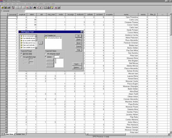 In fereastra de dialog Chi-Square Test (vezi figura 34) selectam variabila pentru care dorim sa testam proportiile, în cazul nostru variabila "consumat" si o mutam în zona Test Variable List. Se pot selecta mai multe variabile , pentru fiecare variabila obtinându-se câte un tabel de frecventa separat.