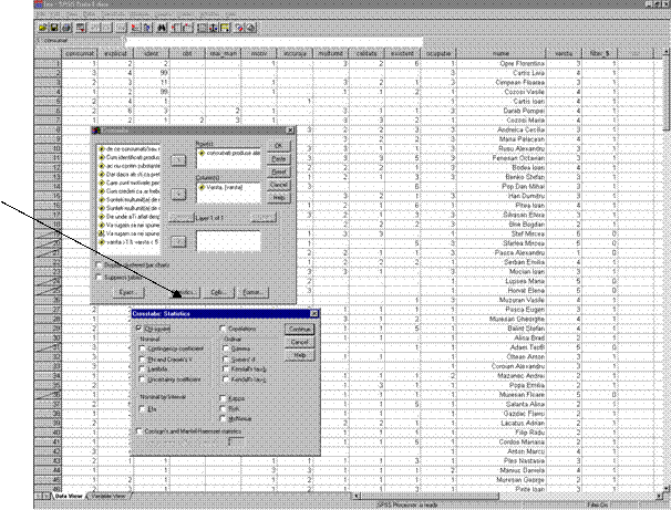 Analog actionând butonul "Statistics" se obtine o noua fereastra din care bifam optiunea Chi-Square ( vezi sageata din figura 36)