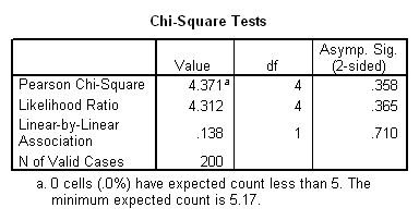 In tabelul Chi Square Test se prezinta valoarea statisticii Hi-patrat (Chi-Square) gradele de libertate (df) si valoarea semnificatiei (Asymp. Sig).