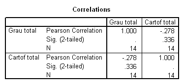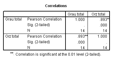 Tabelul Correlations este un tabel cu matricea coeficientilor de corelatie. Valorile sunt distribuite simetric, de o parte si de alta a diagonalei coeficientilor de corelatie egali cu 1, corespunzatori corelatiei fiecarei variabile cu ea însasi. De o parte si de alta a diagonalei tabelului sunt prezentate valorile coeficientilor de corelatie dintre variabile, luate doua câte doua si valorile pragului de semnificatie (Sig.) corespunzator , precum si numarul observatiilor considerate, N.