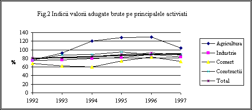 Cum era si de asteptat, reforma a determinat o scadere a productiei în toate sectoarele de activitate (fig.2). În fapt, pe tot intervalul tranzitiei, productia industriala, ca de altfel a tuturor ramurilor neagricole, s-a situat sub pragul celei realizate în anul 1990. În agricultura, productia a avut un caracter sinusoidal, cu oscilatii mari de la o perioada la alta, ceea ce demonstreaza dependenta ei ridicata fata de influenta aleatorie a factorilor naturali.