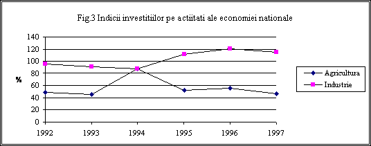 În industrie, efectele negative induse de reforma au fost asa de puternice, încât au anulat eficienta în productie, pe care ar fi trebuit sa o aduca fondurile de investitii, fonduri care au fost crescatoare din 1994 si mult mai mari fata de cele din agricultura, unde au fost descrescatoare dupa 1994 (fig.3).