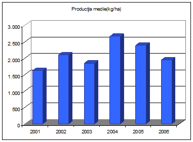 Din tabelul 1 se remarca faptul ca productii medii peste 1500 kg s-au realizat in anii: 1997 - 1920 kg/ha, 1999 – 1838 kg/ha si in anul 1991 – 1654 kg/ha, iar cu cele mai scazute valori sunt anii: 1990 – 742 kg/ha si 1992 – 762 kg/ha. Datorita soiurilor si tehnologiei aplicate productiile medii a crescut in ultimii ani.