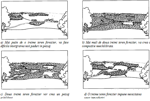 Urmatoarea etepa o va constitui stabilirea dimensiunilor noilor terenuri forestiere, astfel incat, ele sa se incadreze in scara generala a peisajului. In terenurile plane, introducerea unor mici palcuri de arbori va contribui la sporirea diversitatii peisajului. Suprafetele mici de padure vor fi greu de incadrat in peisajele vaste sau in cele cu forme de relief accentuate. La stabilirea dimensiunilor noilor terenuri forestiere se va tine cont de necesitatea realizarii unui echilibru intre suprafetele impadurite si cele lipsite de padure (Forestry Commission, 1991). De exemplu, un peisaj cu mai mult de doua treimi padure va parea mult prea incarcat si anumite trasaturi ale peisajului initial pot fi mascate, iar daca mai putin de o treime din suprafata va fi acoperita cu padure, terenul forestire va aparea ca un element artificial introdus (fig.1).