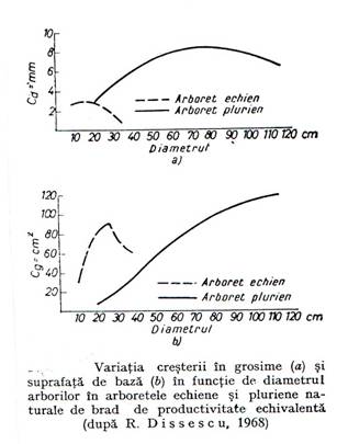 In arboretele pluriene, in care masivul se creaza in planuri diferite si cantitatea de lumina disponibila pentru arborii mai inalti este mai mare, de acest plus de lumina se folosesc mai ales arborii grosi si de grosime mijlocie care ajung la grosimi mai mari decat in arboretele echiene(figura 5.6.).